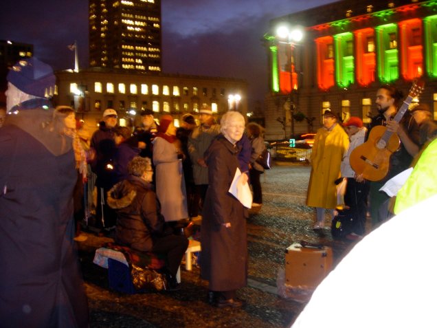 Last night, for the nineteenth time in as many years, San Franciscans assembled in front of City Hall for the Interfaith Memorial Service For All Our Homeless Dead, organized by Reverend Glenda Hope with SF Network Ministries, along with the Coalition On Homelessness. Half a dozen laypeople and religious leaders — a rabbi; a Zen Buddhist nun; a housing activist; a Franciscan sister (my boss and roommate, Carmen); and more — presented poems and eulogies, mourning the dead and calling for justice for the living. Alternating with the speeches, one person from a given neighborhood would read aloud a list of names: the recorded deaths of homeless people in that area, in 2009. I think there were between 50 and 60, maybe more. A singing bowl rang after each name spoken, including, hauntingly, a few nameless: John Doe Number 64 (ding), John Doe Number 67 (ding), John Doe Number 95 (ding) . . .