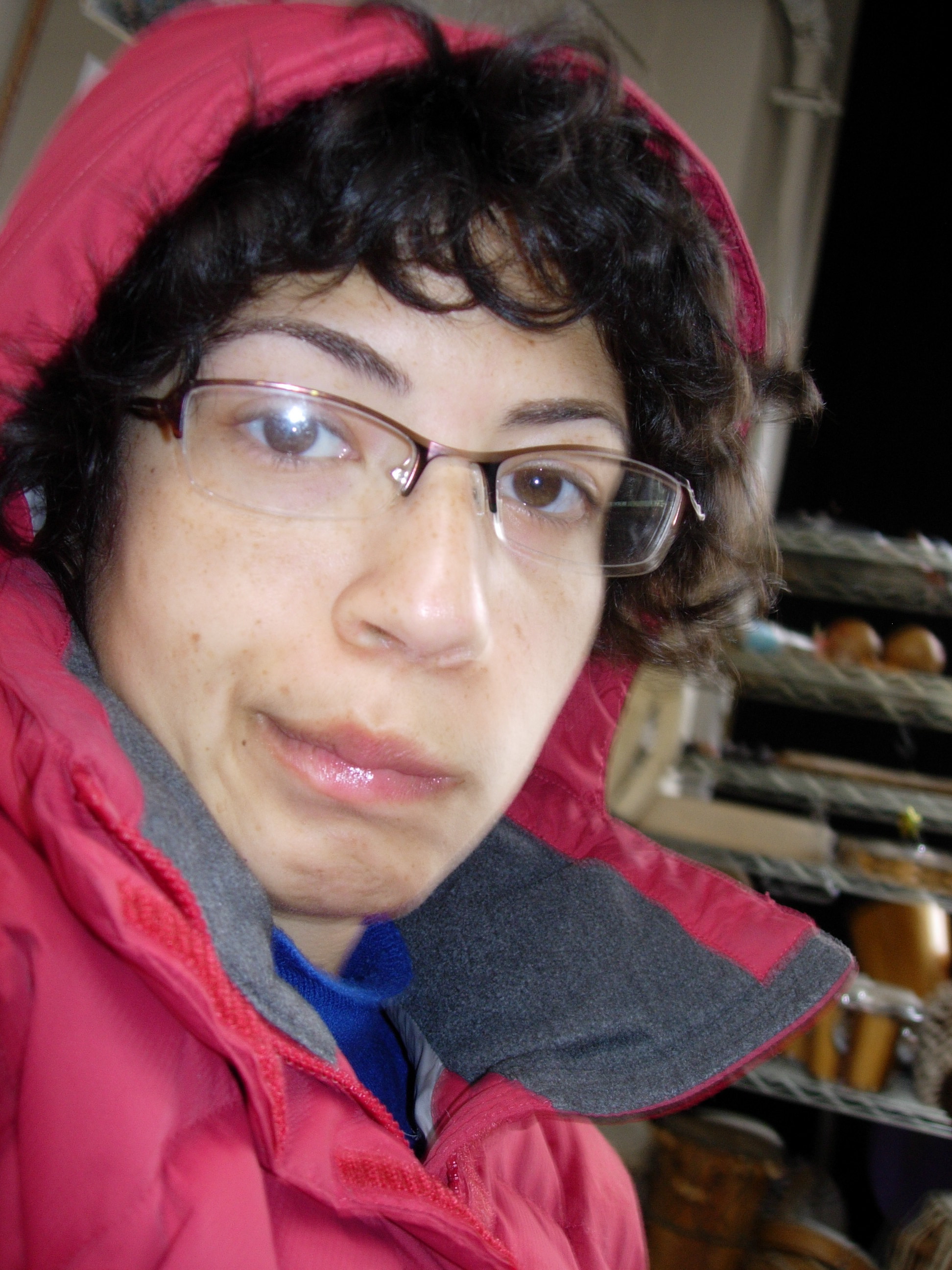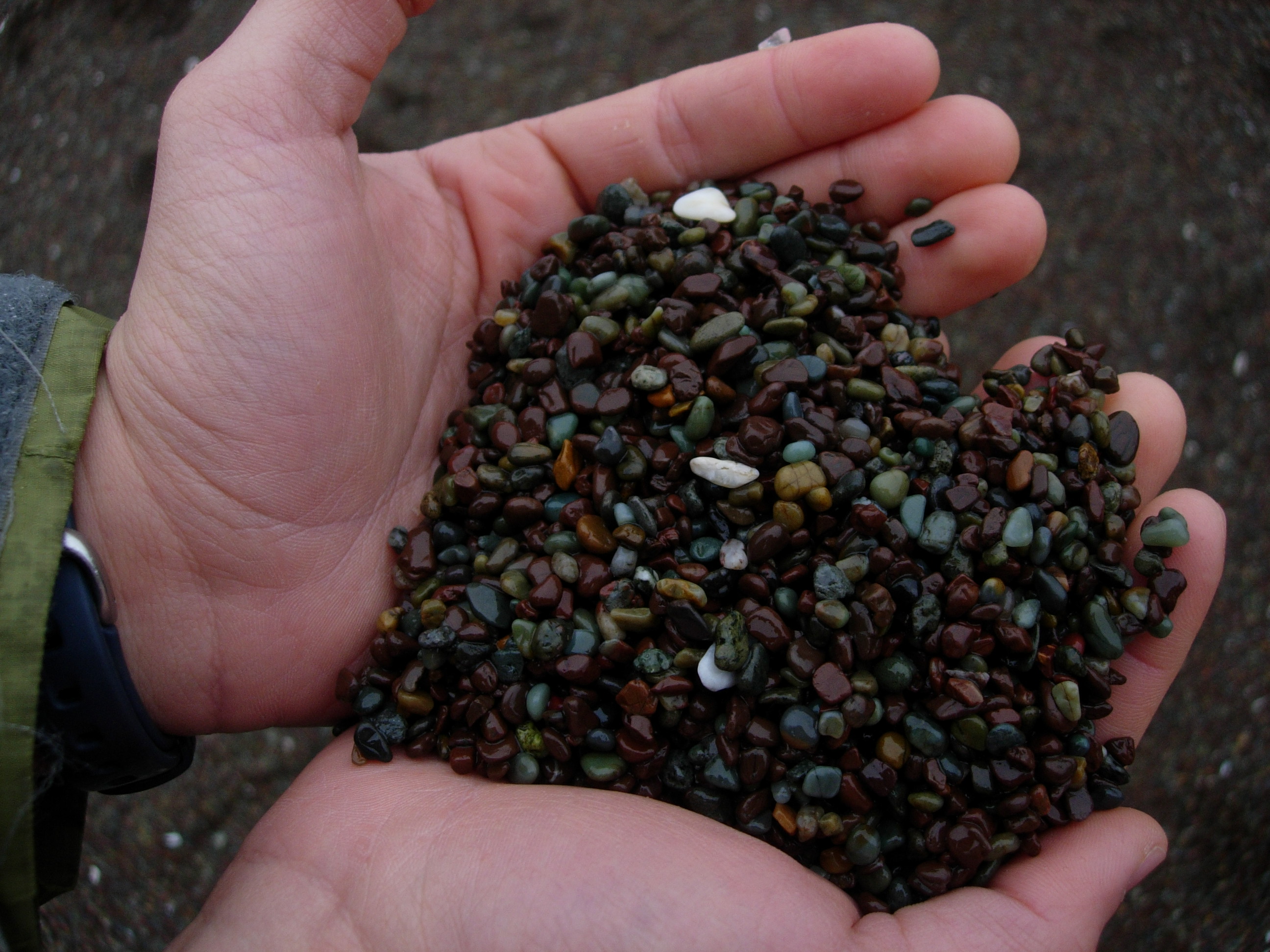 From lovely a gray morning with Cat at Rodeo Beach, where the sand is this beautiful bed of pebbles. Feels glorious to walk on, in the rain: the feet sink down just the right amount.