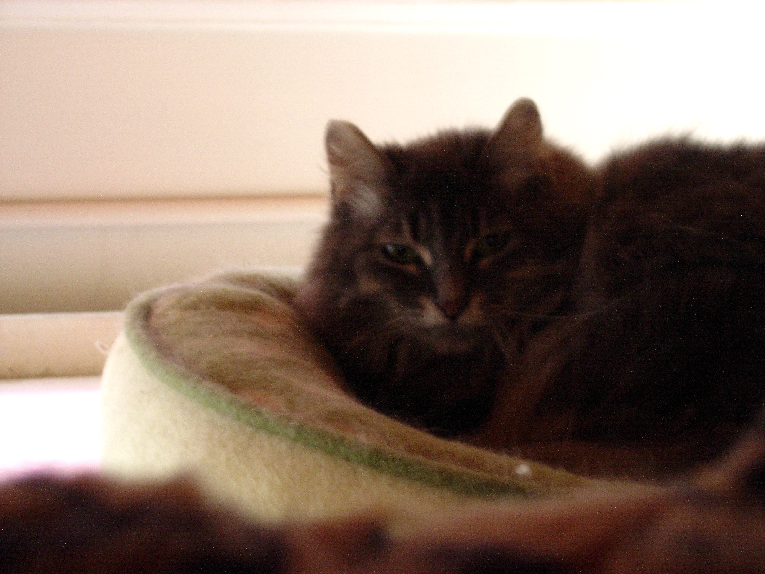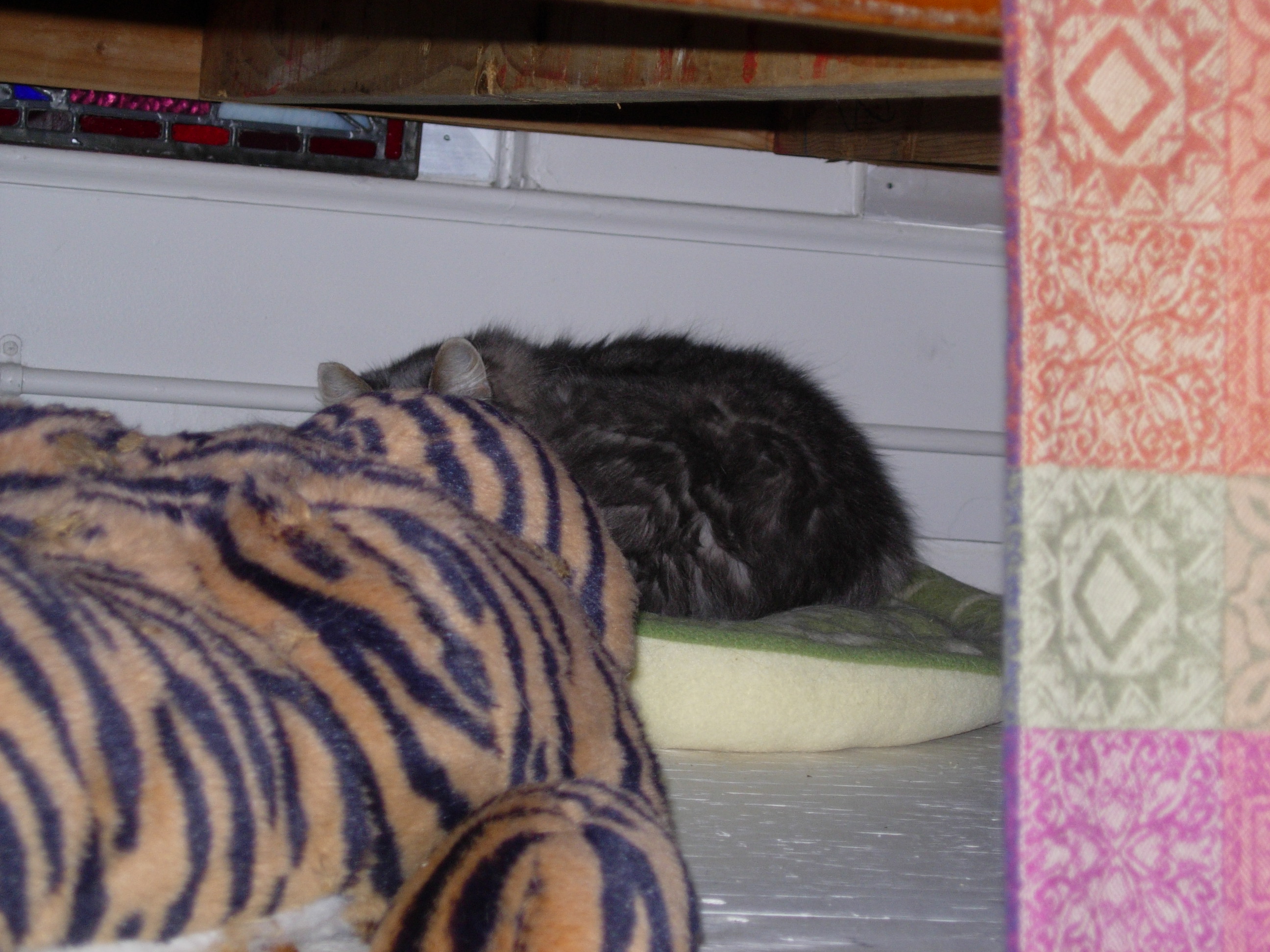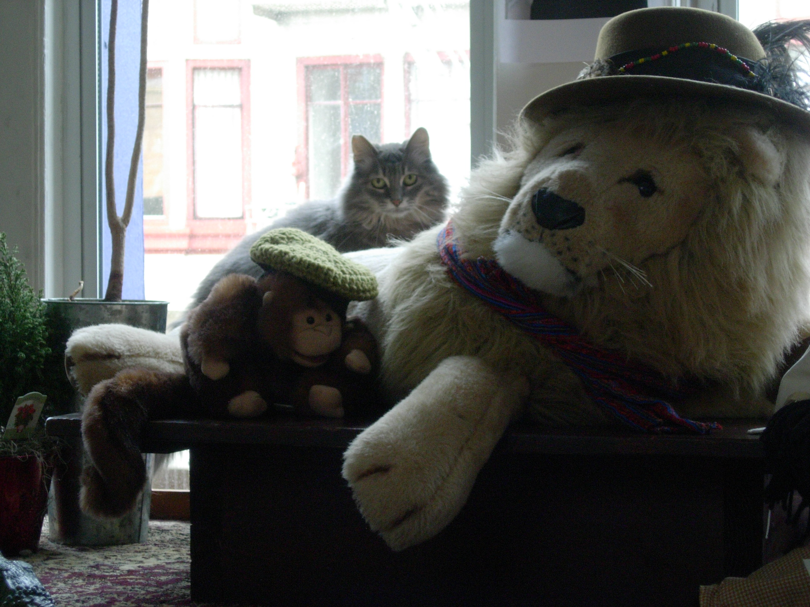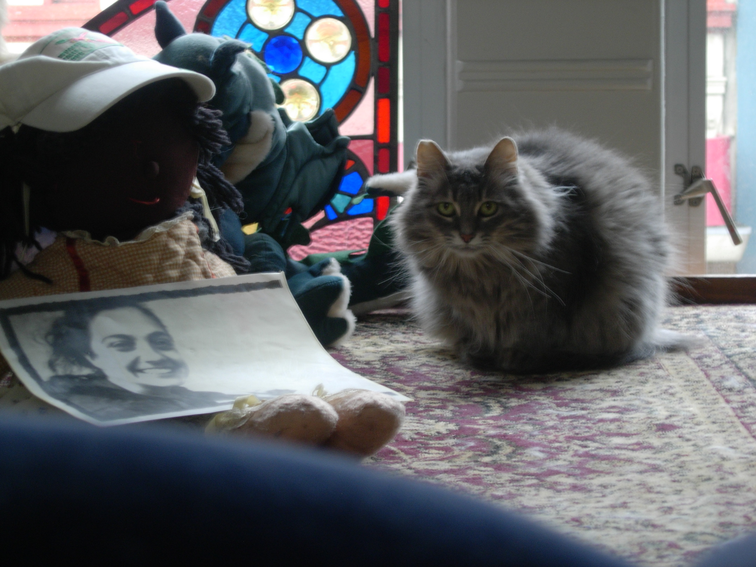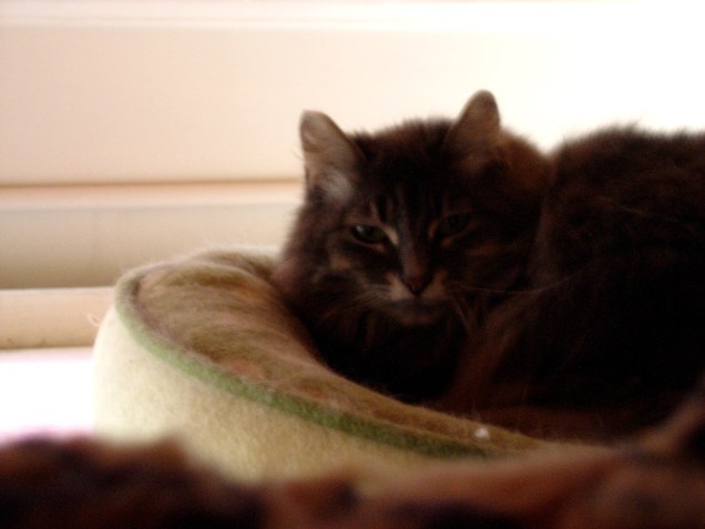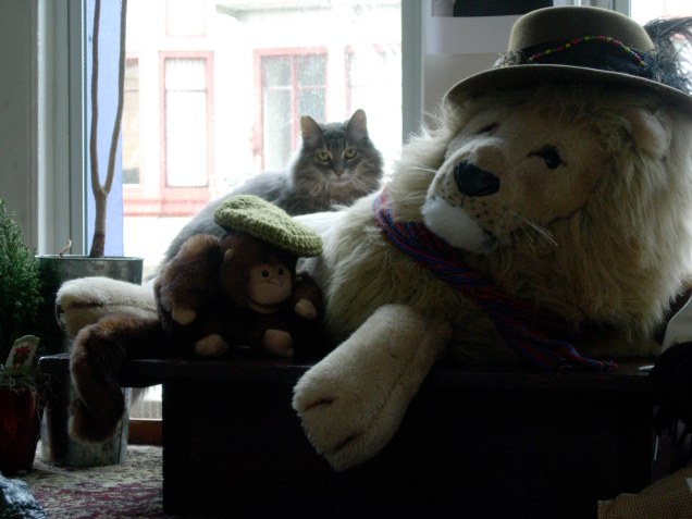 Heather is a feral cat that the Fools took in some years back, and who lives with us — slinking among the stuffed animal menagerie — in the Fools’ Court. For years, I’m told, she wouldn’t even let herself be seen. Now, she’s slowly growing bolder: eating, roaming, and claw-feasting on stuffed armchairs in full view, when there’s only a few of us around. But she’s still supremely elusive — a fact only emphasized by her absurdly gorgeous and adorable looks.