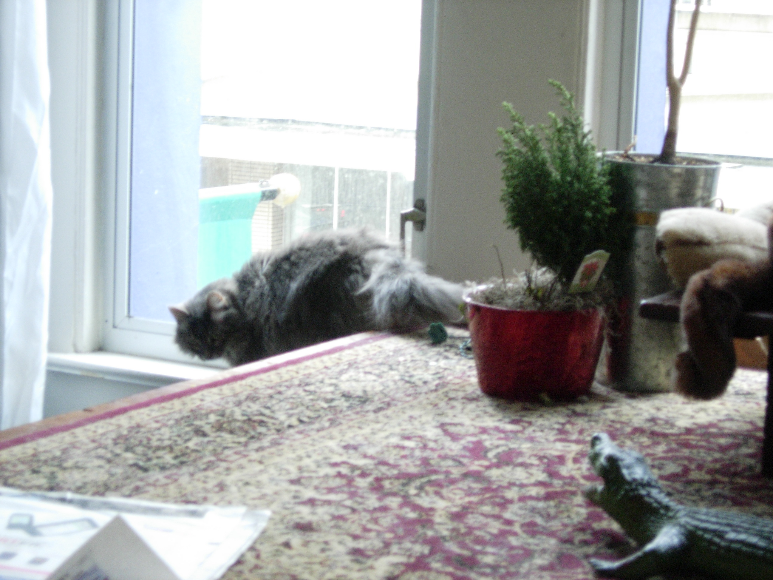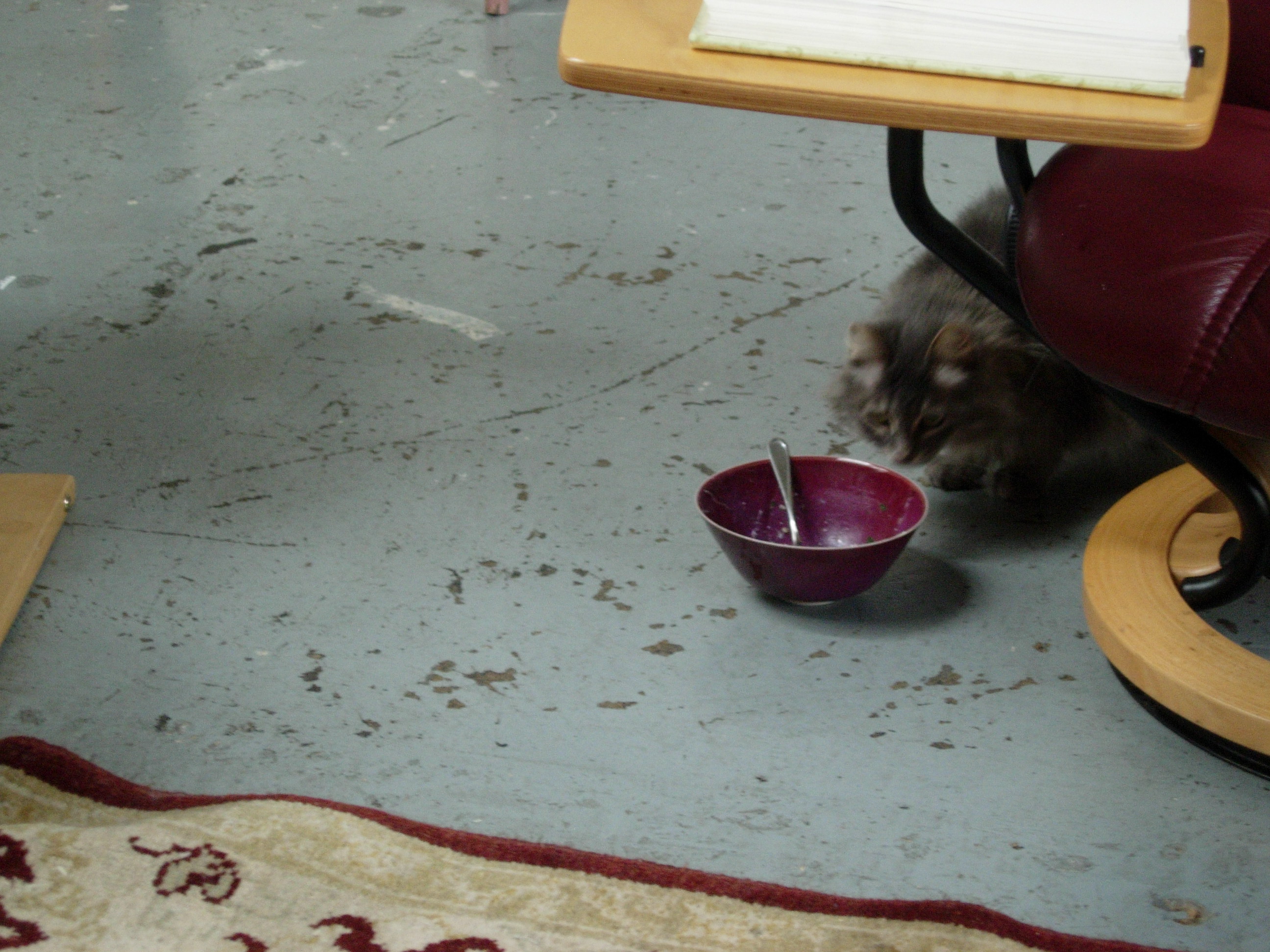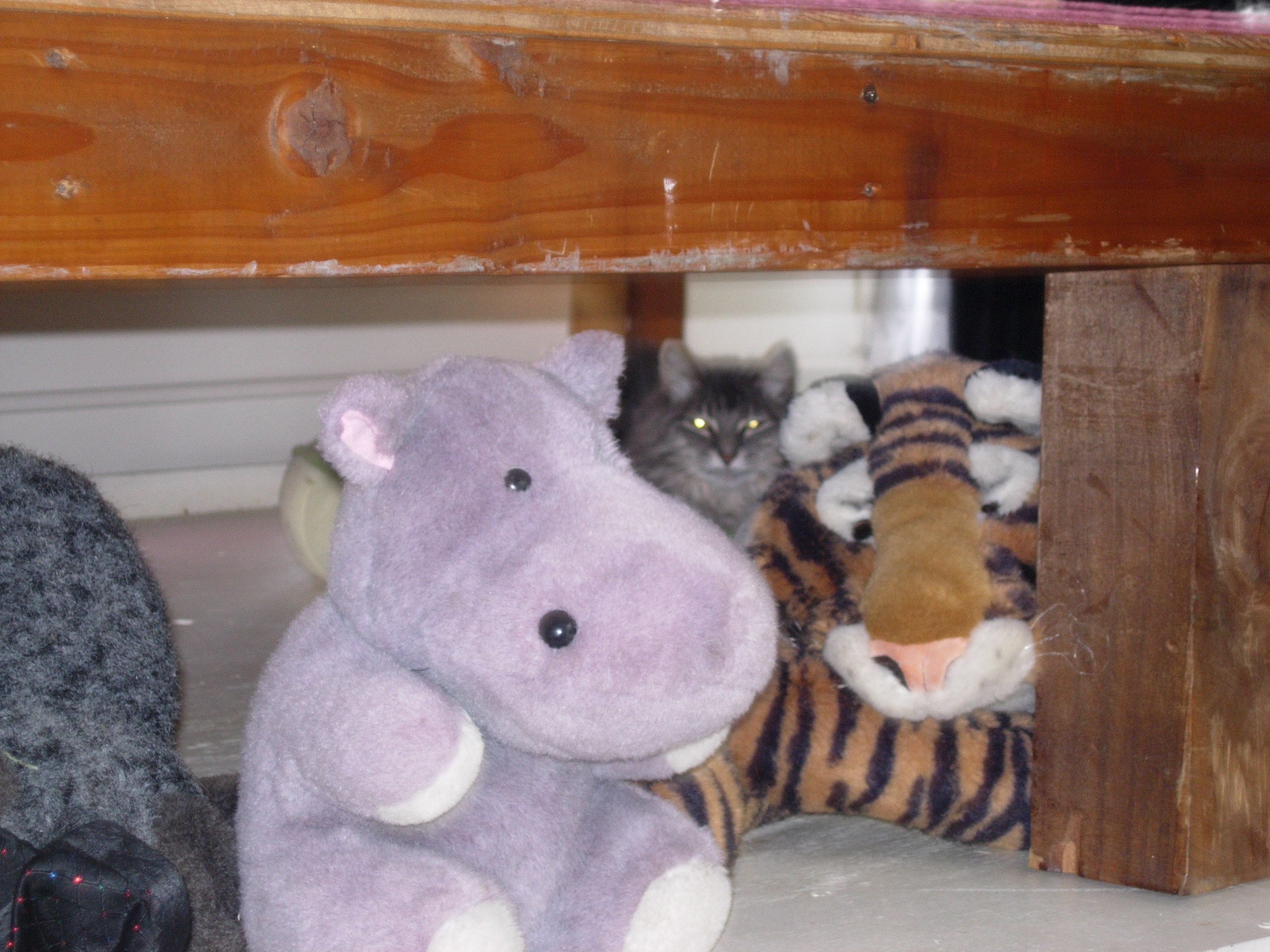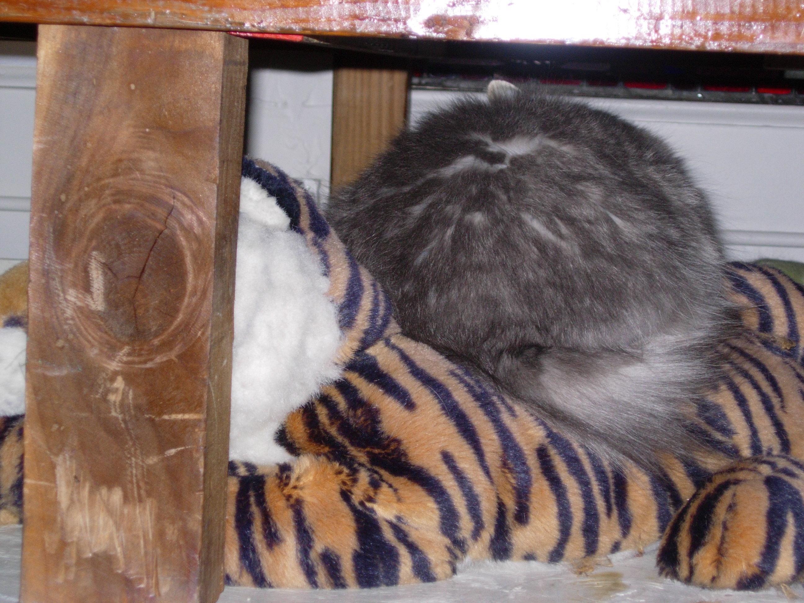 Heather is a feral cat that the Fools took in some years back, and who lives with us — slinking among the stuffed animal menagerie — in the Fools’ Court. For years, I’m told, she wouldn’t even let herself be seen. Now, she’s slowly growing bolder: eating, roaming, and claw-feasting on stuffed armchairs in full view, when there’s only a few of us around. But she’s still supremely elusive — a fact only emphasized by her absurdly gorgeous and adorable looks.