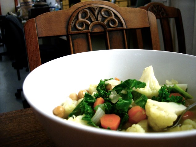 I’ve made this soup, oh, a kazillion times or so. And yesterday I made it again. Will never get sick of it. Kale and cauliflower (two all-time favorite foods) plus carrots, chickpeas, sautéed onions, and a little bulgur for texture and bulk — all swimming in a full-bodied broth deepened with olive oil, spiked with habanero peppers, and brightened with a surprising secret ingredient: orange juice.