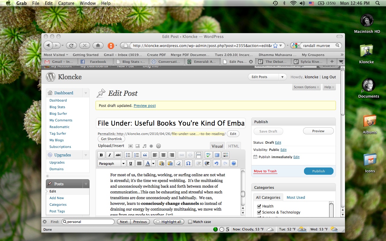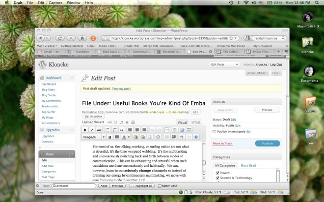 And I’ve been hanging on to the blogging for dear life, trying like heck to publish every weekday. But the truth is, that kind of frequency costs me the time to consider the meta-questions, to develop my nascent theories of mindful blogging. And that’s what I’m in grad school for, after all!