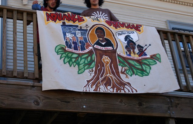 The banner may come in handy tomorrow evening, as the scheduled Radical Sangha will be meeting and then carpooling to San Quentin prison to join the protest of the first death-penalty execution in California in four years. Albert Greenwood Brown is scheduled to be killed by the state on Wednesday. The decision to resume executions (backed by Jerry Brown) was sudden, and has shocked a lot of folks who’ve been doing anti-death-penalty work for years. I only heard about it last Thursday, through folks in Oscar Grant organizing.