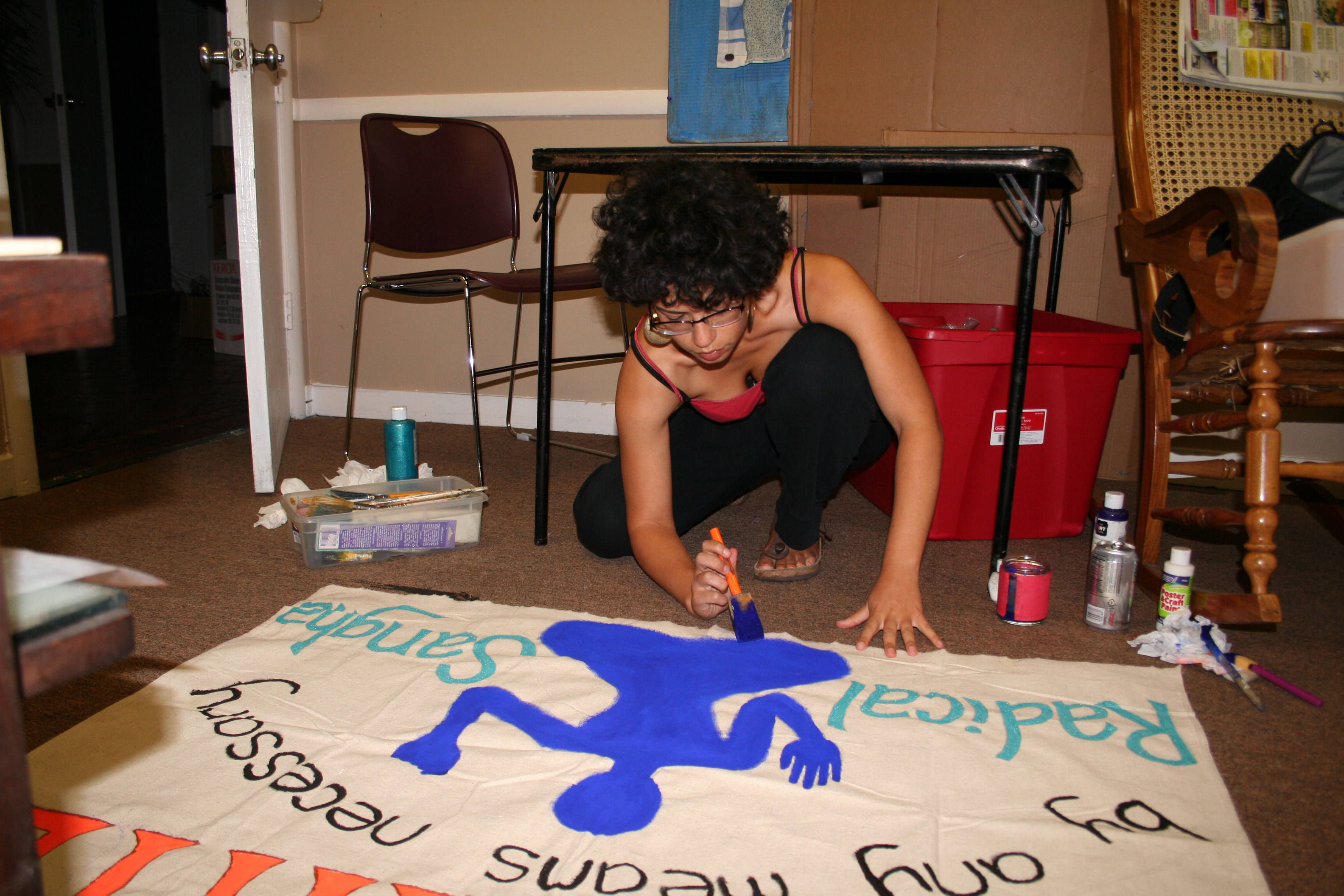 Some friends threw an utterly beautiful “Radical BBQ” yesterday in Oakland. Young and old, different races, different genders and presentations, fun, kind, relaxed, co-operative, joyful, political. Food (good heavens — Dani made these amazing stuffed stromboli and vegan bread from scratch); music and dancing; a speech from a MUNI driver (SF public transit) on the struggles they’re facing among the rank-and-file; wonderful art (check the Advance the Struggle banner: gorgeous). And they even provided art supplies for people to do their own thing. I took advantage and sketched out a small banner to use for Radical Sangha. Took it home and spent the night painting and finishing it up.