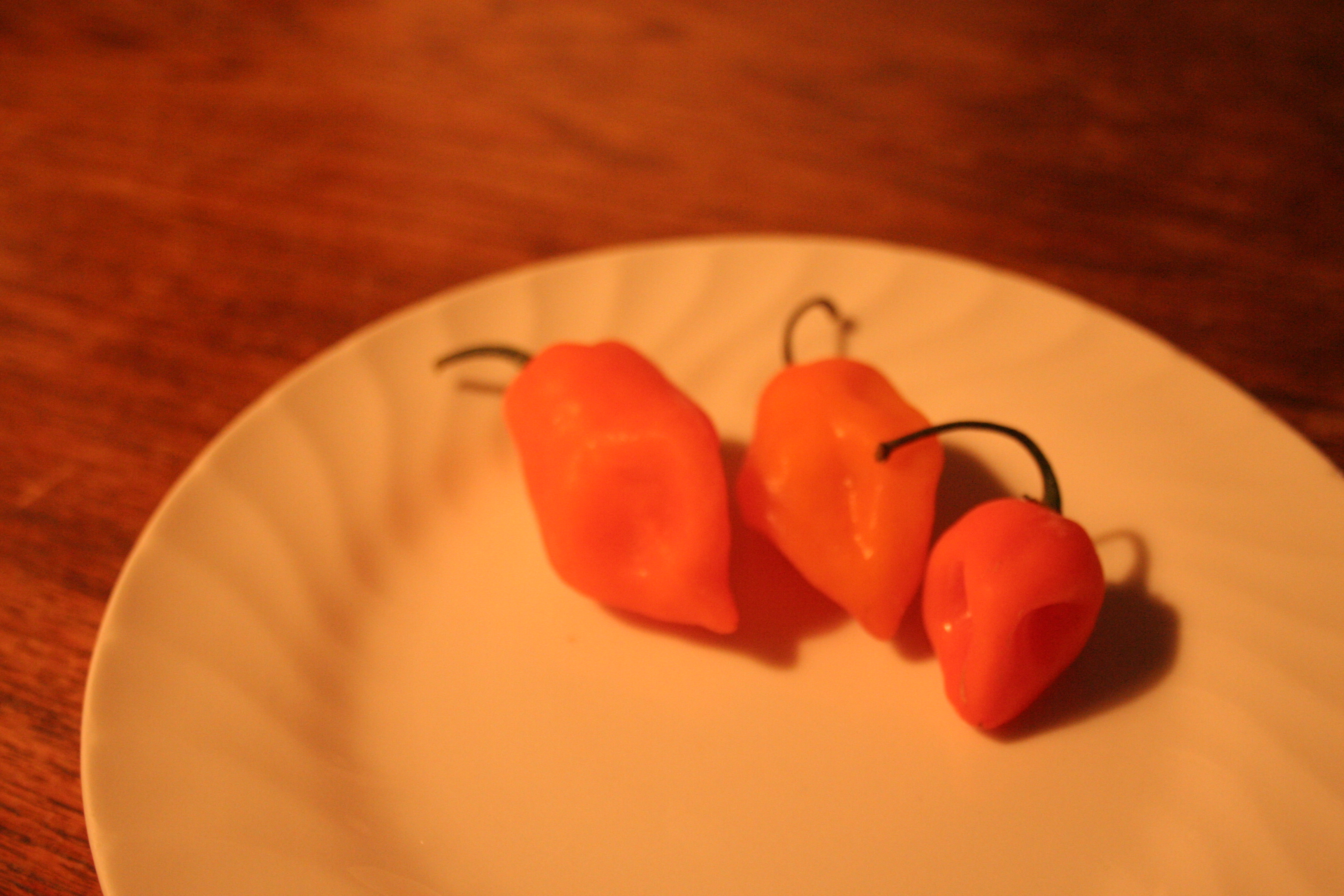 As per our plan, for our one-year dating anniversary, Ryan and I made our own hot sauce. It took 20 roasted habañeros (a.k.a. Scotch Bonnet peppers), four cloves of roasted garlic, and some elusive smoked paprika to blend up this incredibly delicious condiment. (Full recipe below, slightly tweaked from one we found online.) Some of the habs came straight from Ryan’s dad’s backyard garden — part of how we cooked up this idea in the first place.