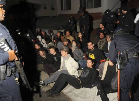 Protesters are arrested in Oakland. Note the giant gun in the officer’s hand on the left. Image from The Hindu.