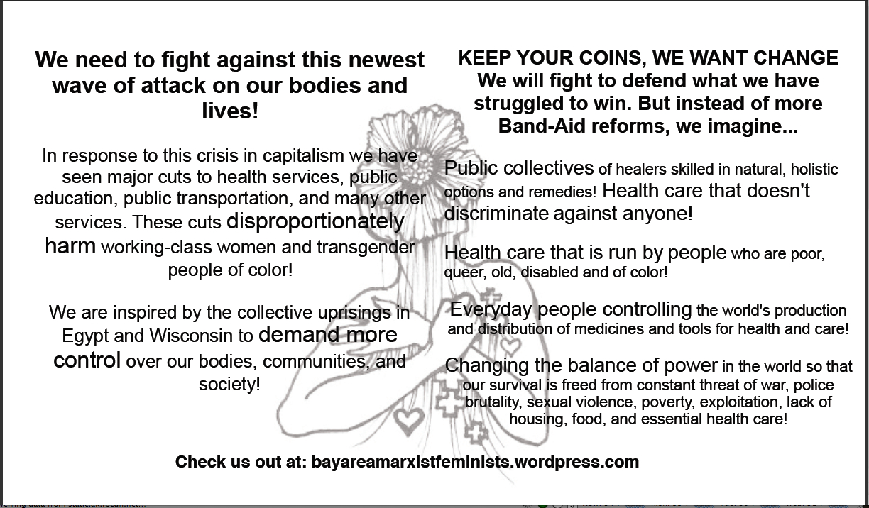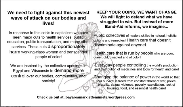 We were not, however, blind to the limitations of the event. A narrow focus on defending abortion rights completely overlooked the ways that austerity measures here in California are generally pummeling working-class people’s access to sexual health care. This myopia has long been a problem of largely white, middle-class reproductive rights movements. Surveying the crowd and listening to the speeches, I felt a little pessimistic about how our half-sheets would go over, fingering capitalism as a major part of women’s oppression and choicelessness.