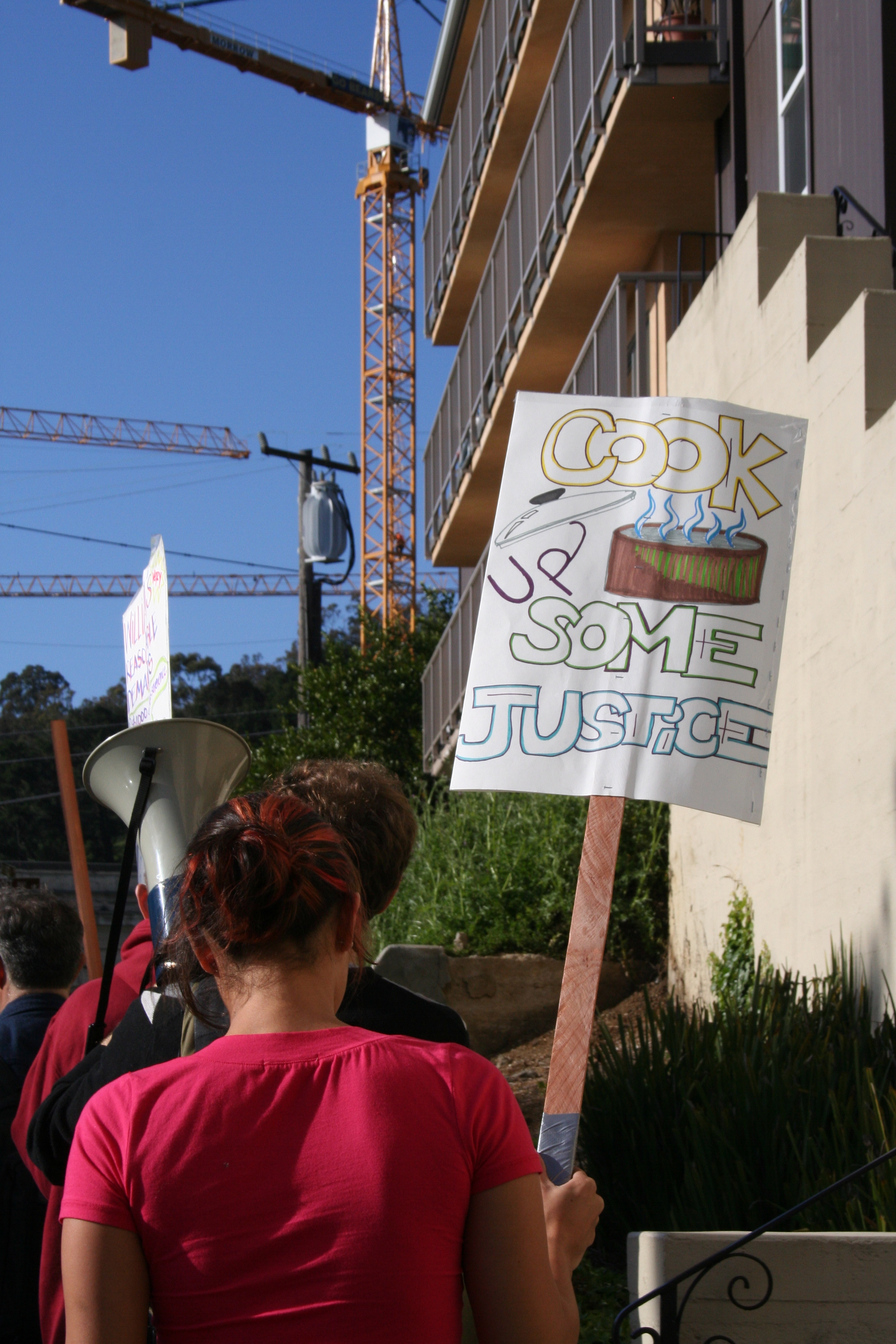 Monday afternoon Bay Sol East kept up the fight in solidarity with former sorority “houseboy” William over in Berkeley, staging an informational picket at Alpha Omicron Pi’s weekly meeting. With handmade signs, a bullhorn, and half-sheet flyers for the sorority sisters, our group of a dozen or so created quite a spectacle on the quiet hillside street. Chants called for “Justice For Domestic Workers!” and urged AO∏ to “Exceed the Expectation” (their motto) and “Cease the Exploitation!”