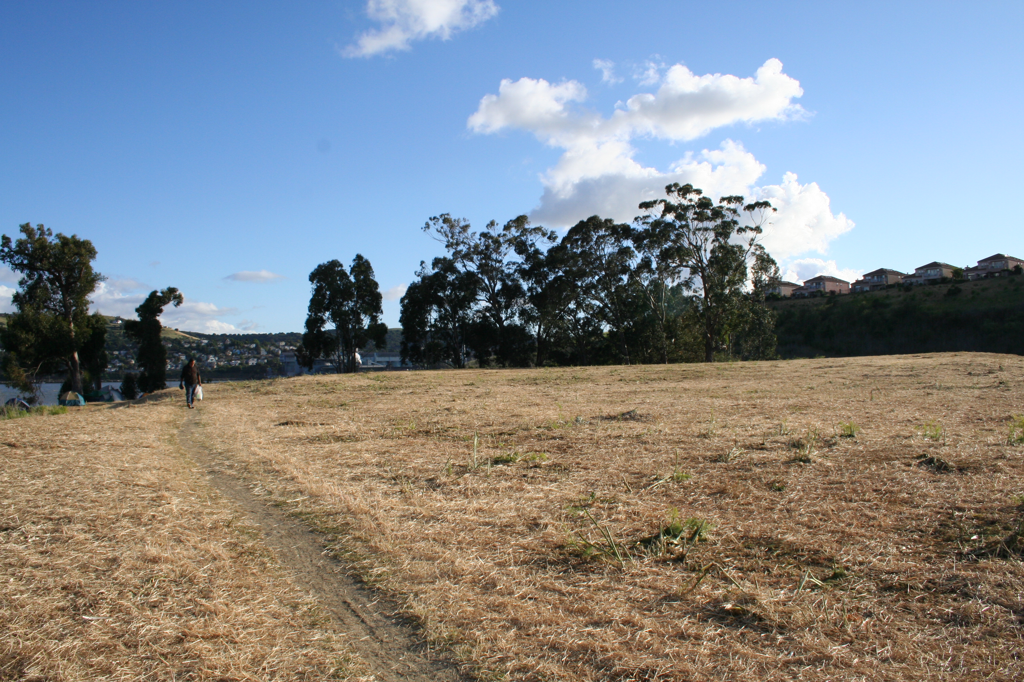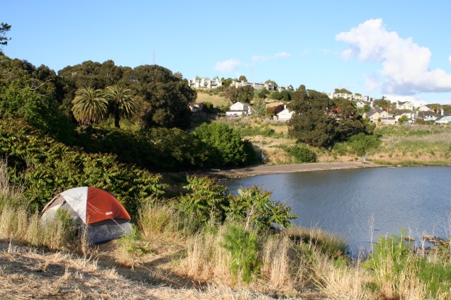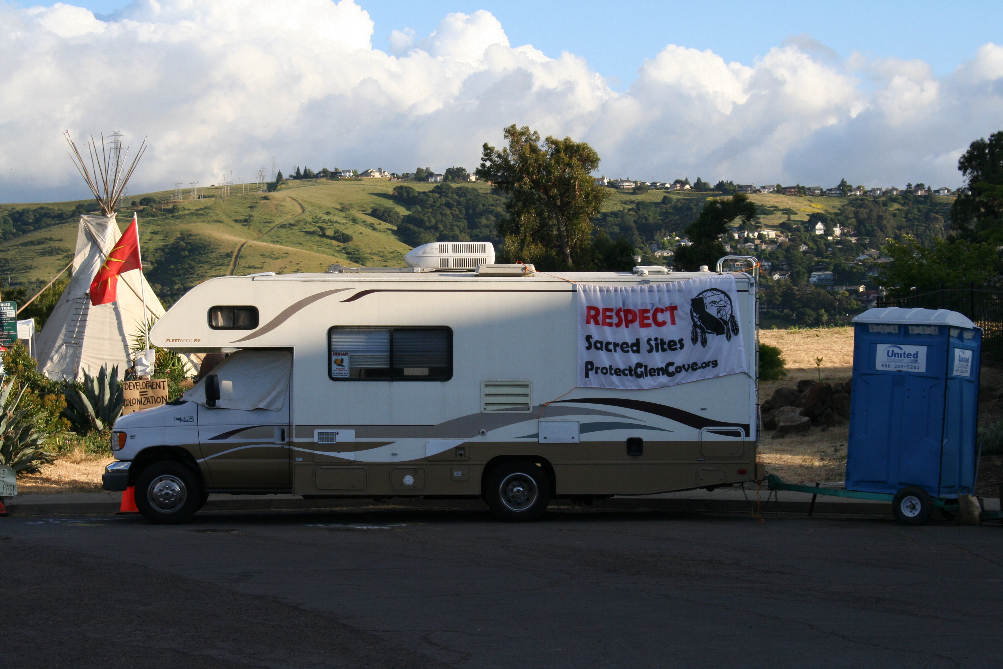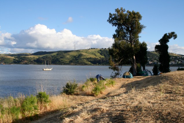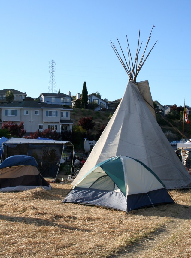 Like I said, I needed this piece more than ever yesterday morning. I was about to drive north with a few friends to Glen Cove, in Vallejo. There, indigenous people and allies have gathered for over 30 days to defend a sacred burial site — one of the few remaining mostly-intact shellmounds (indigenous burial grounds) in the Bay Area — from being paved over to create a redundant parking lot, bathrooms, and needlessly re-routed biking trail. The link above leads to their web site, which is comprehensive and has a lot of beautiful photos. Here are some that I took yesterday, with permission.