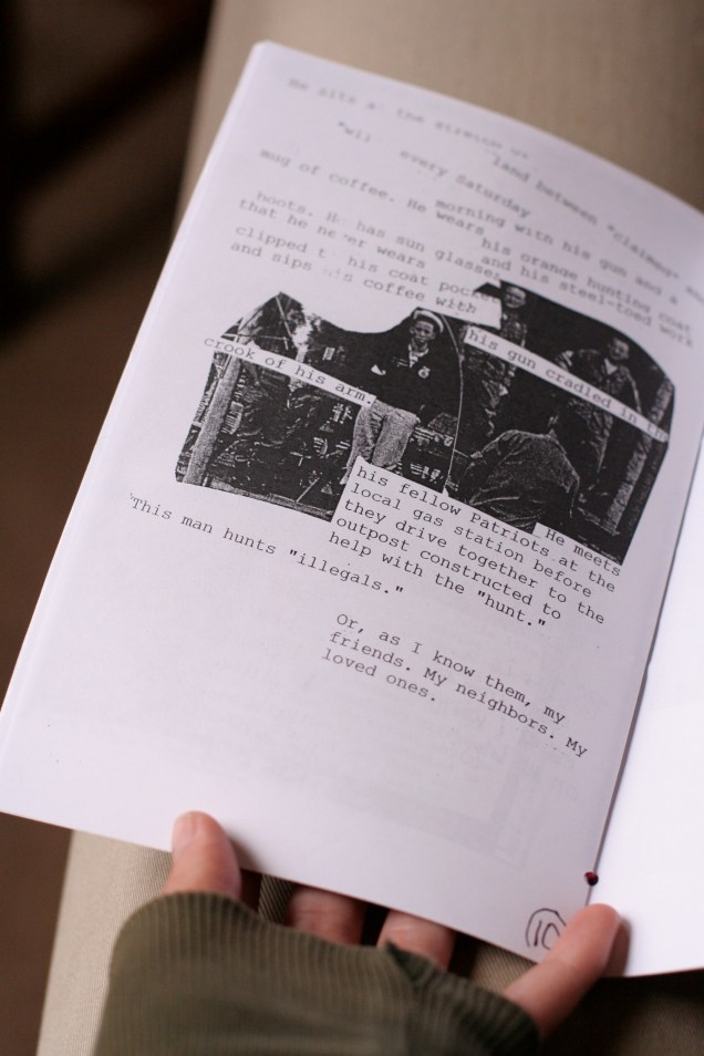 Bfp, courageously, shows compassion for this hunter (“[H]e needs the companionship his fellow patriots offer and the desert is beautiful in the early morning hours”), but when this man tracks down “illegals,” he murders “my friends. My neighbors. My loved ones.” And so, faced with coercion, exploitation, and murder, we begin to see how “Control is intimately connected to movement.”