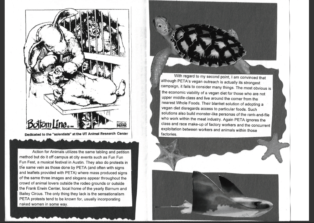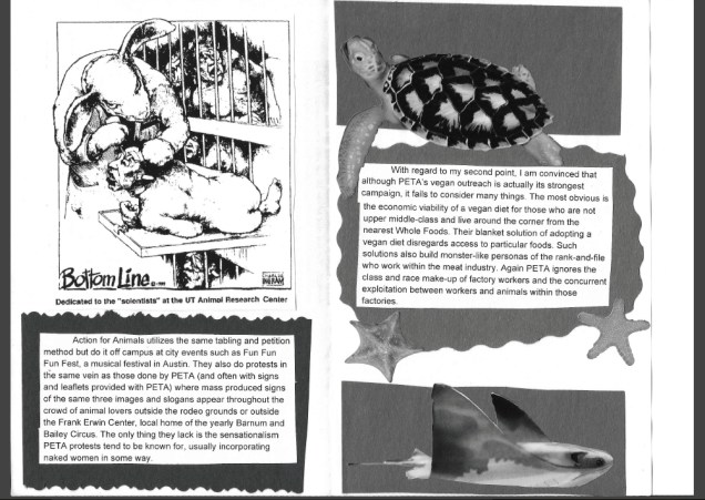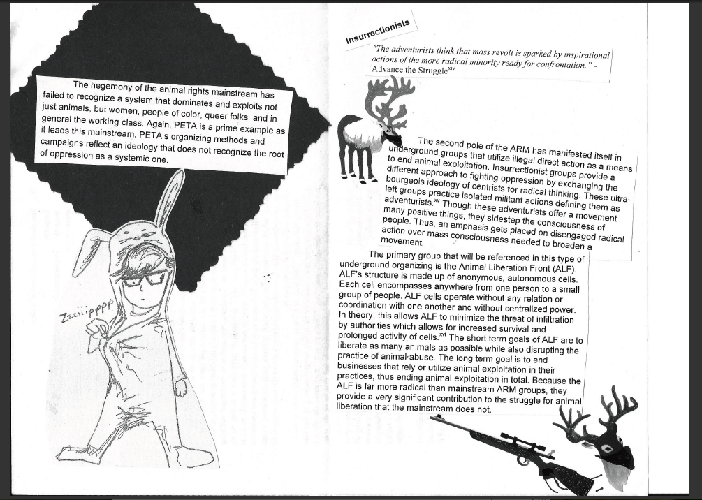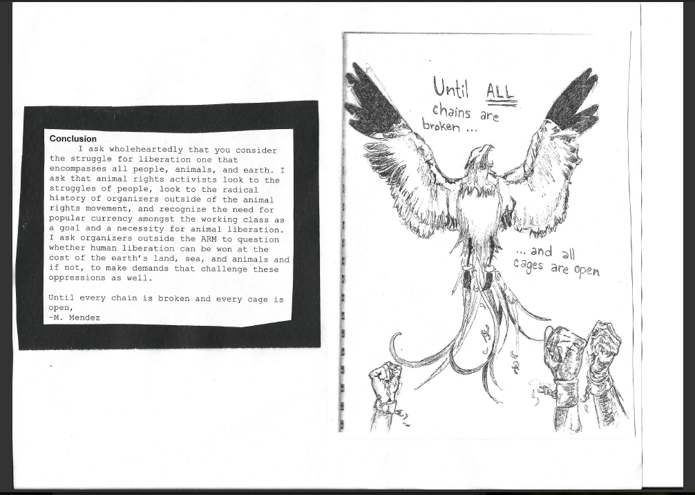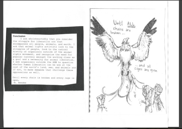 Just kidding; sorry for the lapse! Today’s zine, from a member of Austin-based group ¡ella pelea!, is especially exciting for its application of class consciousness theory from Advance the Struggle’s Oscar Grant pamphlet (featured on Zine Week Day 2) to the Animal Rights Movement (ARM) in the U.S.