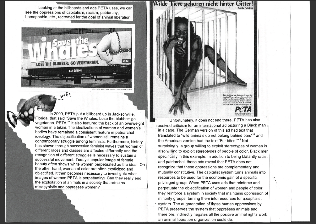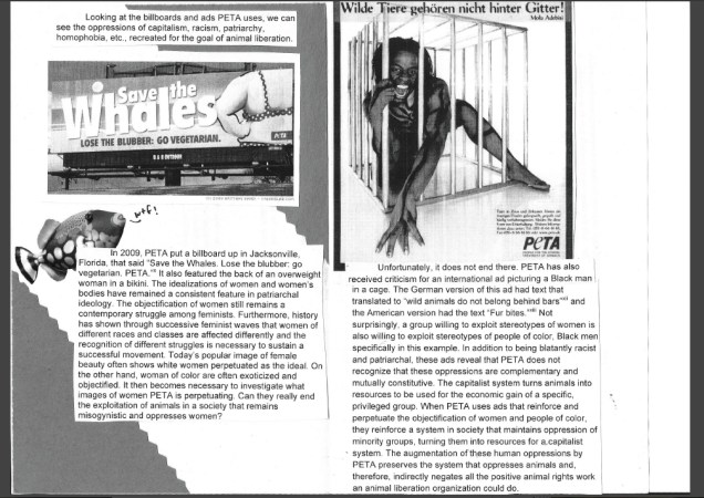 My friend Jamal once characterized liberal ARMers as (I’m paraphrasing) the kind of people who, in rushing to help a caged bird, will heedlessly trample starving orphans. This zine author beautifully engages that contradiction: how mainstream groups like PETA claim to promote liberation, yet use racist, sexist imagery, collaborate with the state, and generally ignore and compound human exploitation and oppression.
