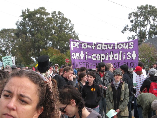But outside the gates of San Quentin, surrounded by visible and hidden state guns, what are we to do? Consciousness raising and calling out the government seems to be the default. The little (big?) crowd cheers on speaker after speaker, many of whom invoke human rights discourse — some calling on the UN to forbid certain common incarceration practices. They urge us to phone the governor. Hey, I don’t really have a better idea. But I sure don’t trust reforms to last, to *not* be rolled back or shifted into the same ugly equilibrium some other way. So although I bear witness spiritually, and my skin ripples at the words of a political poem or the sight of a queer+feminist anti-capitalist banner, I find myself wishing, again, for more strategic analysis.