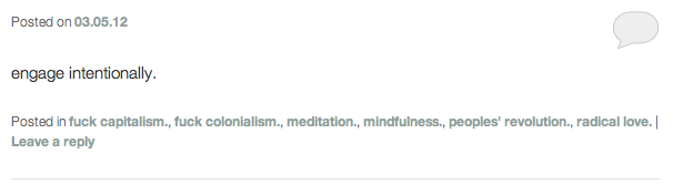 Huli’s subtitle tells no lies: there are three posts on this blog, and only two of them have words. But they are very good posts — the two essays rich with clear argument and emotional intelligence — about struggle in Oakland and on Kauai (where she used to live and organize with native Hawai’ians). My offline relationship with Huli kind of mirrors her blog: quality over quantity. I see her only rarely, but every time I do, I come away with a bounty of challenging shit upon which to reflect.