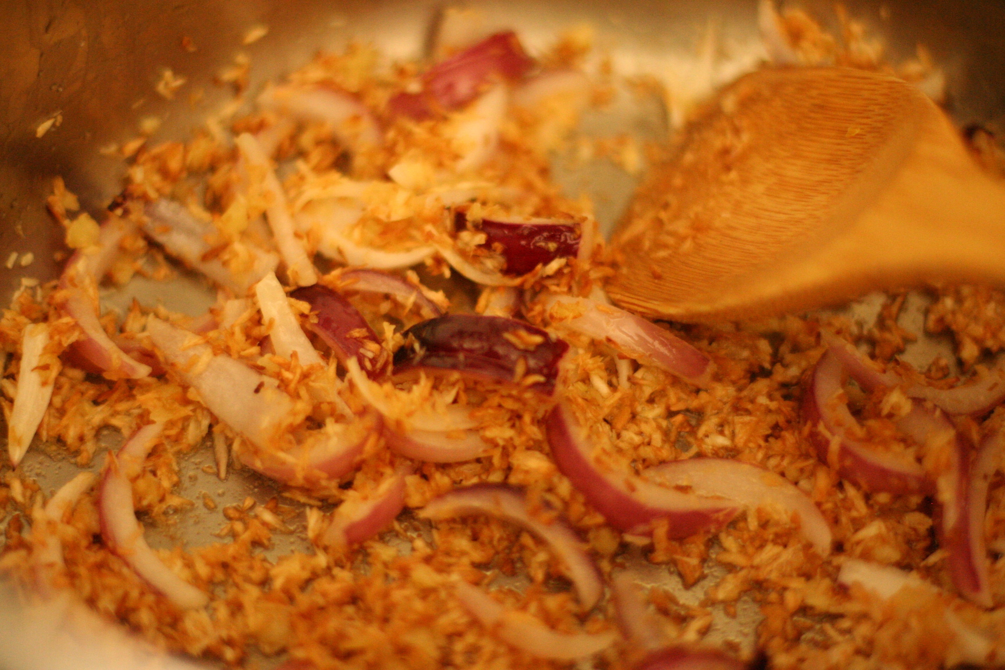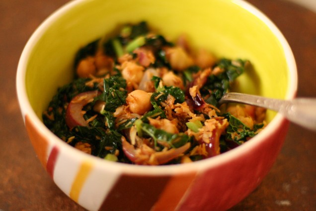 coconut-ginger kale with chickpeas, lemon, and a secret ingredient: a dash of smoked paprika.ginger, toasted coconut, and small sweet red onion sizzling in olive oil