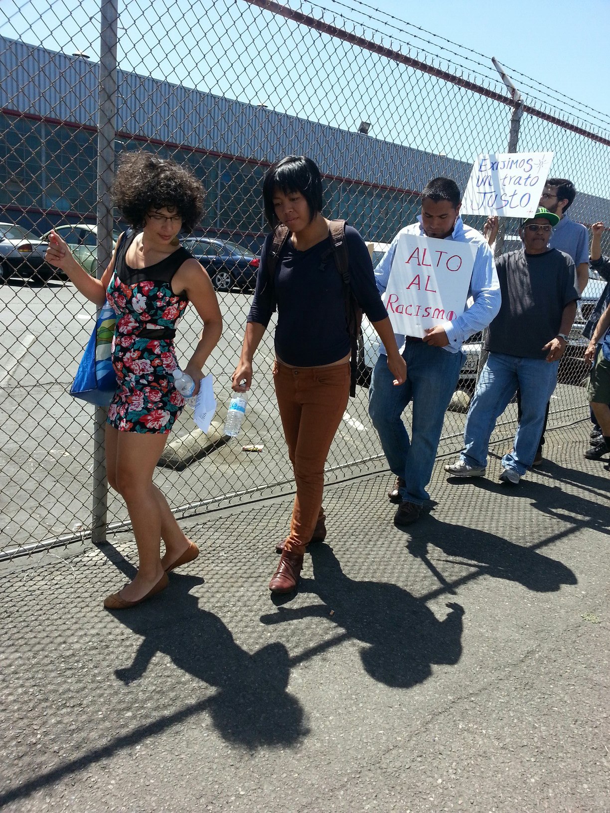 Eventually, some combination of the political content, the live brass band, and my encouragement does the trick. They walk over with me. I immediately introduce them to other people, older people. An elderly worker strikes up a conversation in Spanish with the neighbor who speaks it. Only then does it come out: the neighbor says, “Yeah, I know someone who works in here” (inside the factory that we’re protesting).