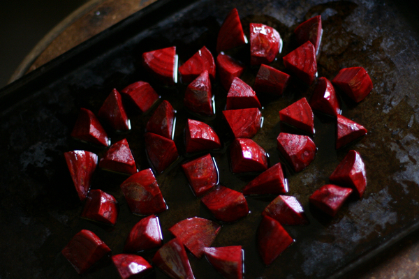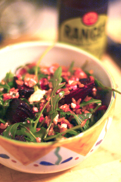 I had been looking for a new way of using farro, a grain I adore for its chewy heartiness. Saw a beet, farro and arugula salad on a menu in SF and thought I would try my hand at something similar.