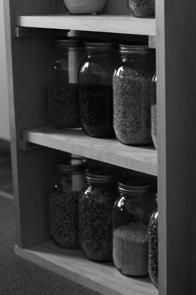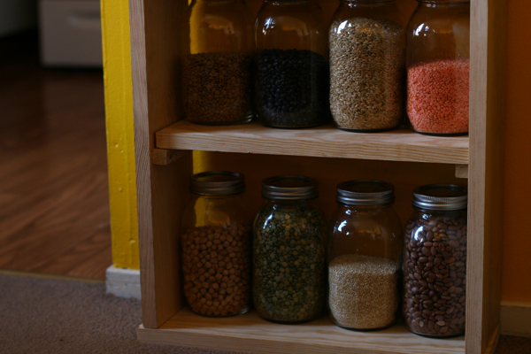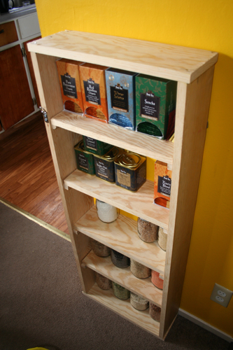 So today, with my mom’s instructions and some friendly help from the landlord’s husband, this new mini-pantry came together. Highly imperfect, construction-wise, but I love it anyway.