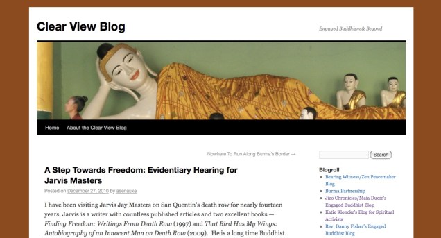 Just barely out the gate, Alan’s blog is already shining. Current events (national and international); incredible music (DAMN!); and personal/political reporting on the ongoing hearing of author, Buddhist, and death row prisoner Jarvis Masters — with whom Alan has cultivated a friendship for nearly 14 years. At Alan’s invitation on the blog, I joined supporters for part of the first day of Jarvis’ hearings in Marin. As someone who particularly appreciates blogs that bridge the online/offline divide, I’m so grateful that the CVP’s very first post was an offering for prison-support action. Dope, dope, dope. And the icing on the cake: Alan’s a superb writer. Clear View Blog: check it out, if you haven’t already.
