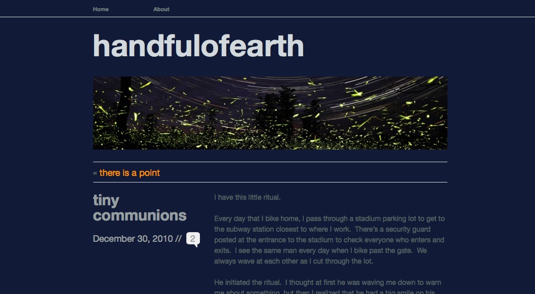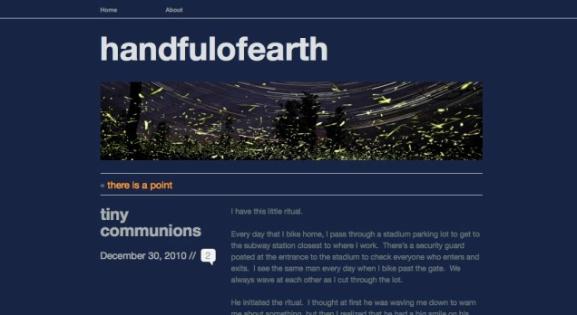 And the second new blog, like most of the sites on my blogroll, is by a longtime friend and fellow young status-quo-questioner (who chooses to remain anonymous). The first few postings on handful of earth are personal and insightful, with the kind of sweet storytelling that, when you’re finished reading, makes you want to go on with your day a little differently; a little better. I especially love this dharma-infused reflection on a daily commute ritual with a stranger, commenting on the connection between generosity and joy.