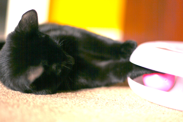 Yesterday I watched Ella once again engage her Sisyphusean toy: a tempting pink ball encased inside a large plastic donut, with side-holes just large enough to accommodate a grasping paw.